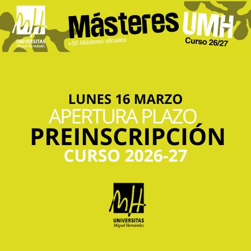 Abierto Periodo de Preinscripción Másteres Universitarios UMH 2026-2027 desde el 16 de marzo a las 10h. Preinscríbete